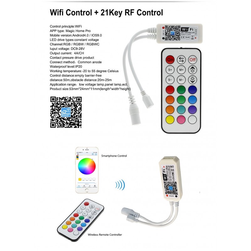 El controlador WiFi LED CRGBCCT38424WIFIK21 está diseñado para las tiras de LED RGB+CCT. Después de una fácil instalación y configuración, puede utilizar el Smartphone para controlar la luz de las tiras led RGB+CCT .