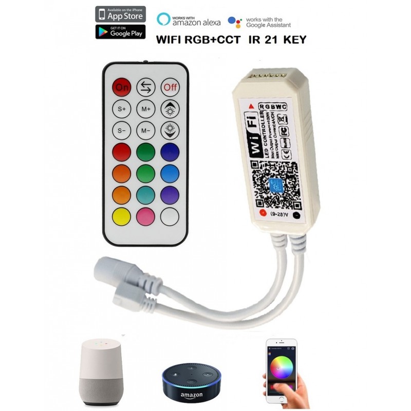 El controlador permite conectarse a dispositivos de Amazon Alexa (eco) y Google assistant para poder controlar su iluminación RGB+CCT desde estos dispositivos.