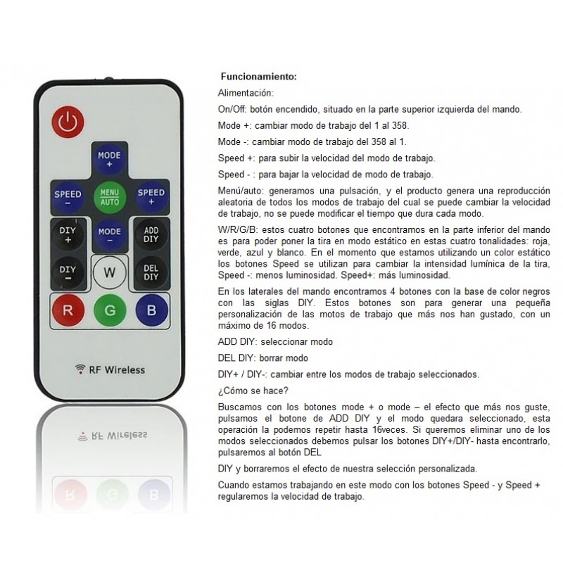 Desde el mando a distancia por radiofrecuencia, puedes controlar los diferentes programas de las tiras PIXEL LED. El controlador dispone de un total de 358 programas con diferentes efectos y transiciones (Ajuste de brillo, flash, parpadeos y función de rateo).