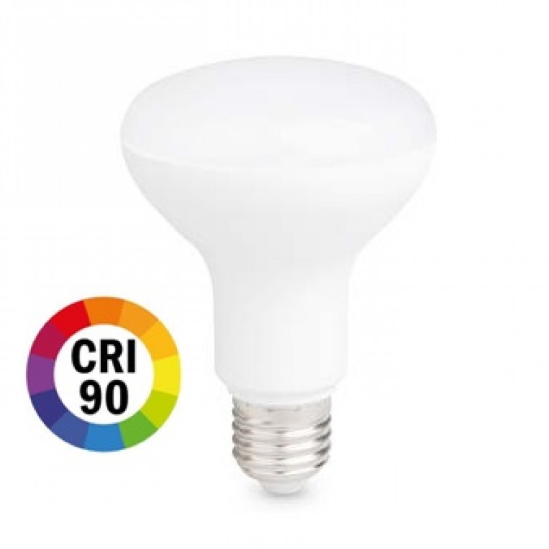 Bombilla LED R80 E27 10W CRI90 R80E2710WCRI90, para sustituir bombillas incandescentes R80, consiguiendo un ahorro energético superior al 90%. Disponible para casquillo E27 en luz Cálida y/o Fría. Su larga vida útil supone un enorme ahorro económico en mantenimiento y sustitución.de alta potencia lumínica con un CRI mayor de 80, un factor de potencia del 0,92 y una duración de más 50.000 horas.