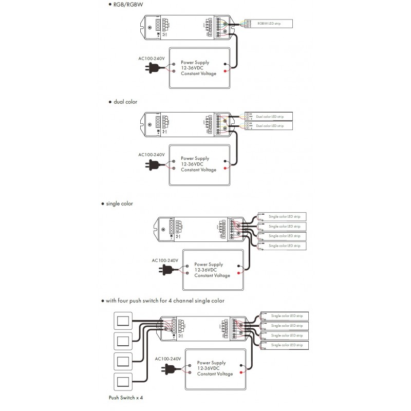 Receptor Controlador Eco para tira LED monocolor, RGB y RGBW 12-36V 4 canales 240-720W CRGB720E4C, solamente necesita instalar las tiras que desee controlar (hasta 4 zonas) y realizar una sencilla configuración, con lo que tendrá un control total de todas las tiras LED de su instalación de forma inalámbrica. Cada zona o grupo de tiras que se necesiten controlar de forma independiente, requiere de un controlador. Un solo mando puede controlar hasta 4 zonas distintas, de forma conjunta o independiente.