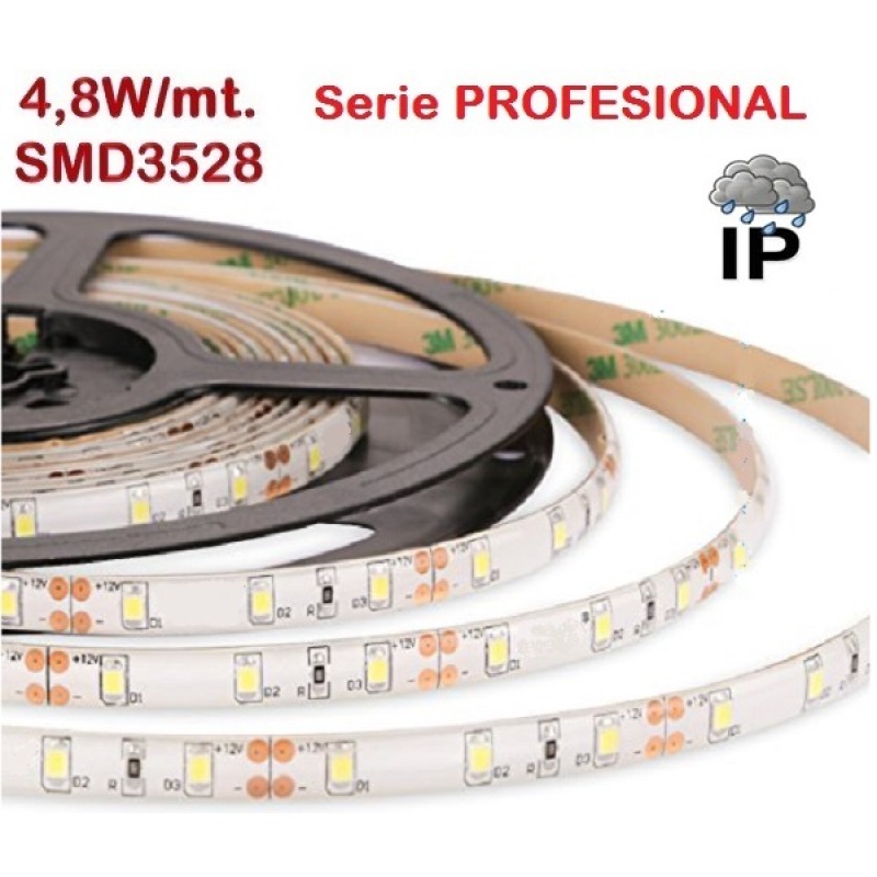 Tira LED 5 mts Flexible 24W 300 Led SMD 3528 IP65 Blanco Cálido 2800ºK, serie Profesional TLF24WWIP65PRO 4,8W/mt 60 Led/m.