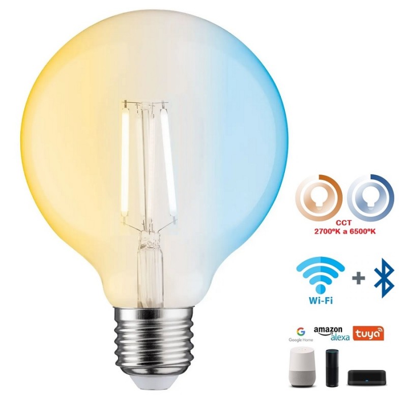 · Bombillas LED Globo G125 Clara E27 Filamento 6W 850lm CCT Wifi+Bluetooth, para Smartphone y control voz G125CE276WCCTFWB, son perfectas para sustituir a las bombillas incandescentes tradicionales. Son entre un 80-90% más eficaces ahorrando en la factura eléctrica, duran hasta 10 veces más, no emiten calor y son más ecológicas que las bombillas incandescentes.