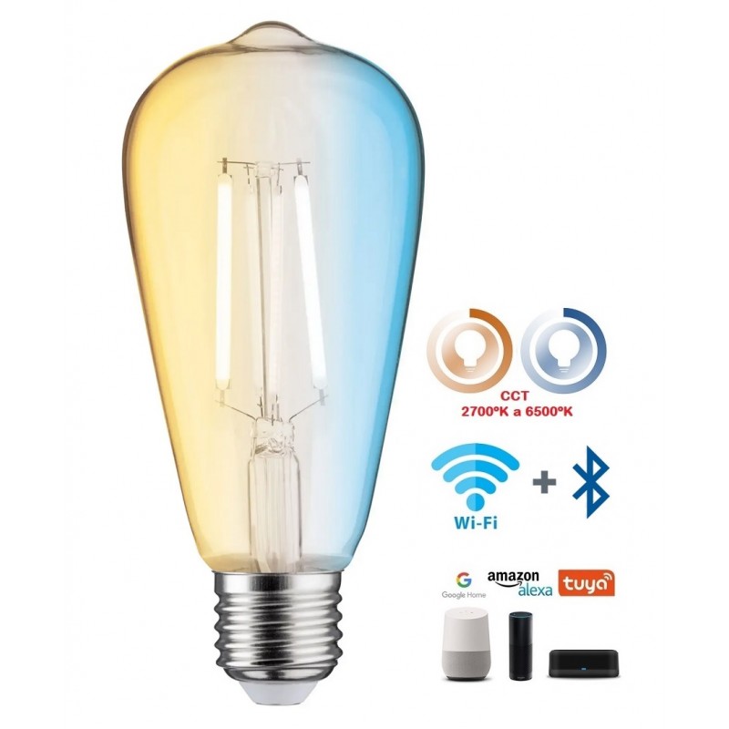 Bombillas LED Edison ST64 Clara E27 Filamento 6W 850lm CCT Wifi+Bluetooth, para Smartphone y control voz ST64CE276WCCTFWB, son perfectas para sustituir a las bombillas incandescentes tradicionales. Son entre un 80-90% más eficaces ahorrando en la factura eléctrica, duran hasta 10 veces más, no emiten calor y son más ecológicas que las bombillas incandescentes.