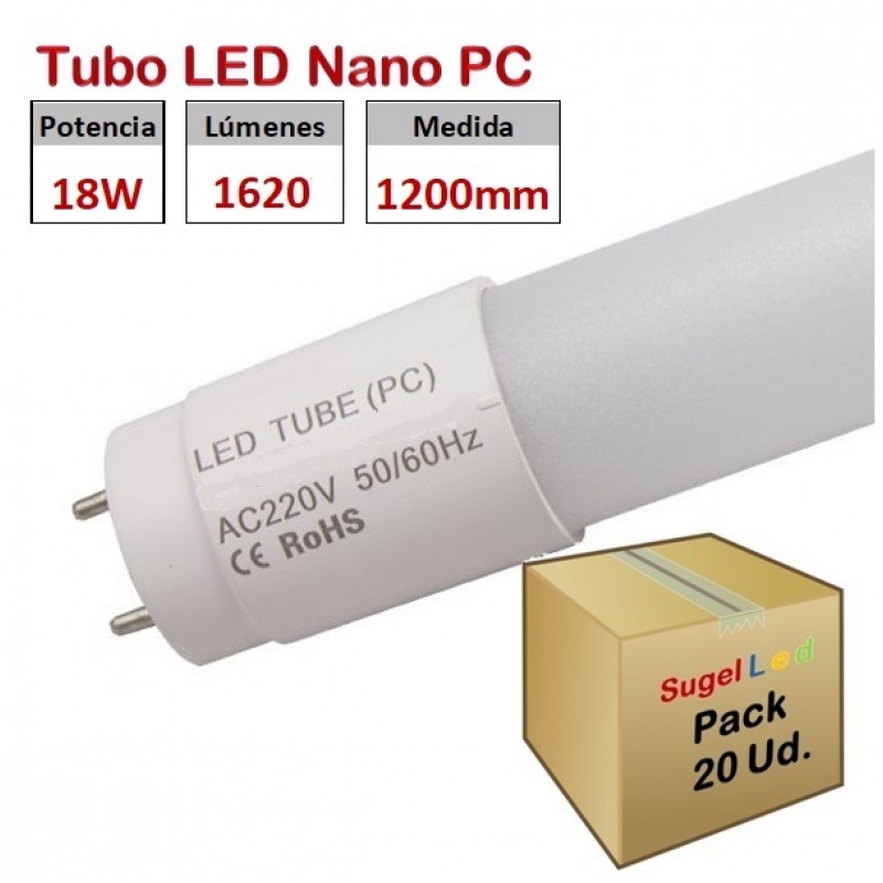 Tubo LED FT8PC1218WE20 T8 1200mm Nano PC Eco 18W, conexión 1 lado, Caja de 20 ud. Tubo fabricado con nuevos materiales de Nano plástico, gran calidad, altamente resitente.
