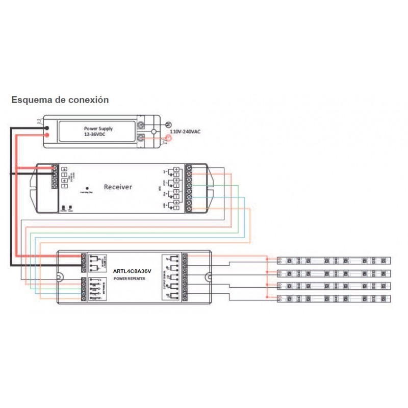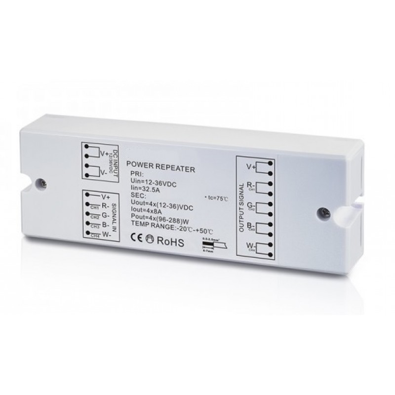 Amplificador Señal par Tira LED RGBW 4 canales 8A 12V-36VDC para voltaje constante para interior ARTL4C8A36V. Necesario para instalación de tiras LED RGBW que superen los 8 metros de longitud o donde la señal necesita más potencia.