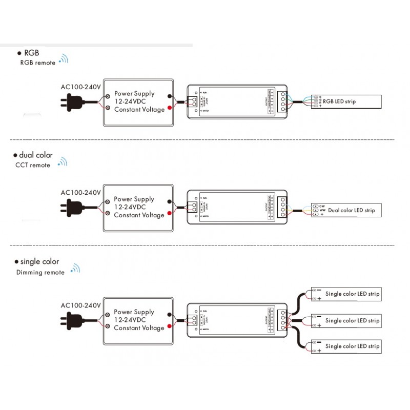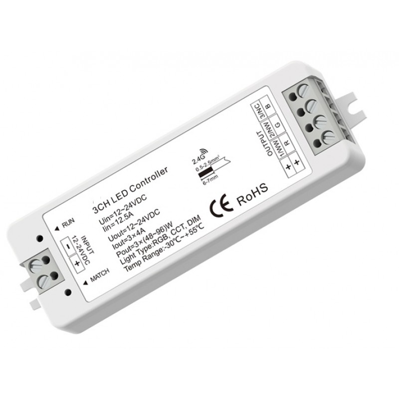 Controlador para tira LED RGB, CCT ó Monocolor 144W-288W 12V/24V CRGB288WV3. Controle el color de cualquier tipo de led RGB con mando a distancia, sube y baja la intensidad de la luz, elije entre un color fijo o cambio de colores automático, fundido de colores, regular velocidad de cambio de colores, etc.