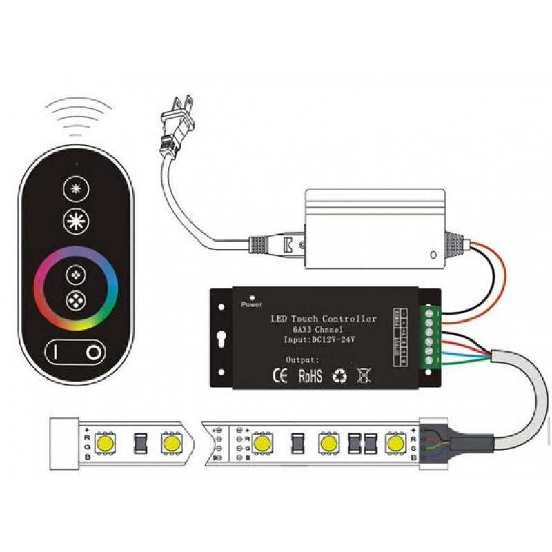 Controlador para tira LED RGB 216W a 12V, 432W a 24V con mando Touch Negro CRGB288WNM. Controle el color de cualquier tipo de led RGB con mando a distancia de 6 botones, sube y baja la intensidad de la luz, elije entre un color fijo o cambio de colores automático, fundido de colores, regular velocidad de cambio de colores, etc.