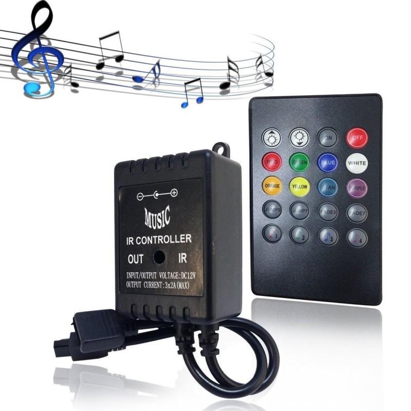 Controle el color de cualquier tipo de led RGB 5V/12V/24V MUSICAL con mando a distancia de 20 botones CRGB72MUSI, sube y baja la intensidad de la luz, elije entre un color fijo o cambio de colores automático, fundido de colores, regular velocidad de cambio de colores, etc.