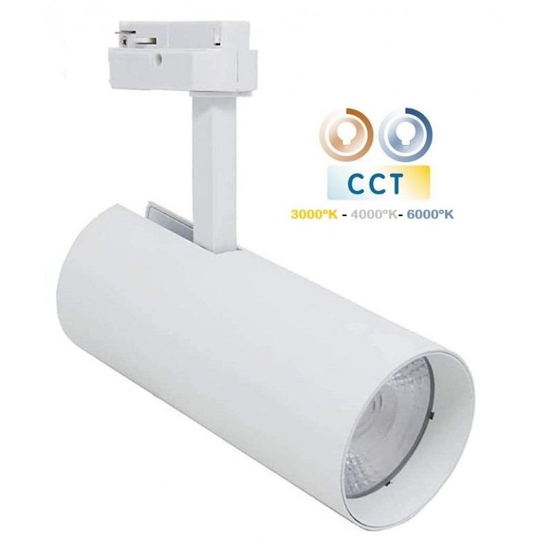 Foco Carril POLAR Monofásico LED COB 30W 36º Blanco CCT Seleccionable FCMBPOLAR30WCCT para carril monofásico orientable y fabricación de alta calidad en aluminio y lacado en color blanco.