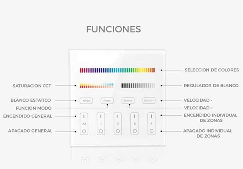 Mando Empotrar Controlador RF Monocolor, RGB, RGBW, CCT, RGB+CCT. hasta 4 zonas