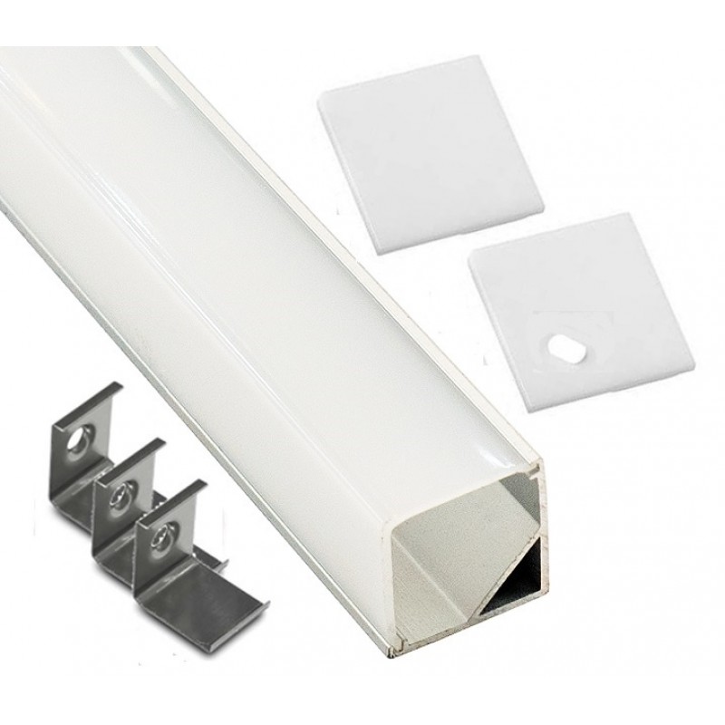 El suministro incluye: 1 perfil de 2mts, 1 Difusor de 2mts, 2 tapas finales y 3 grapas metalicas.