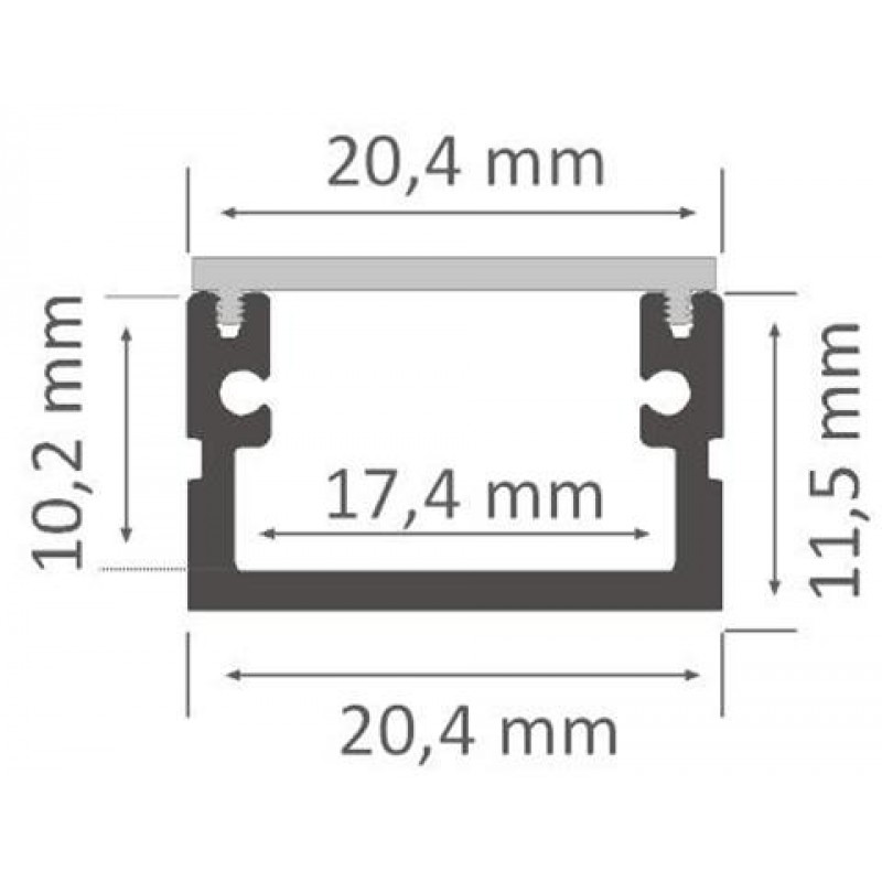 Perfil Superficie de aluminio anodizado Negro de alta calidad, de 20x11mm. PS2011AN. Barra de 2 metros. Se puede escoger el tipo de difusor entre opal, glaseado, transparente ó Negro. Para instalar tira de LED.