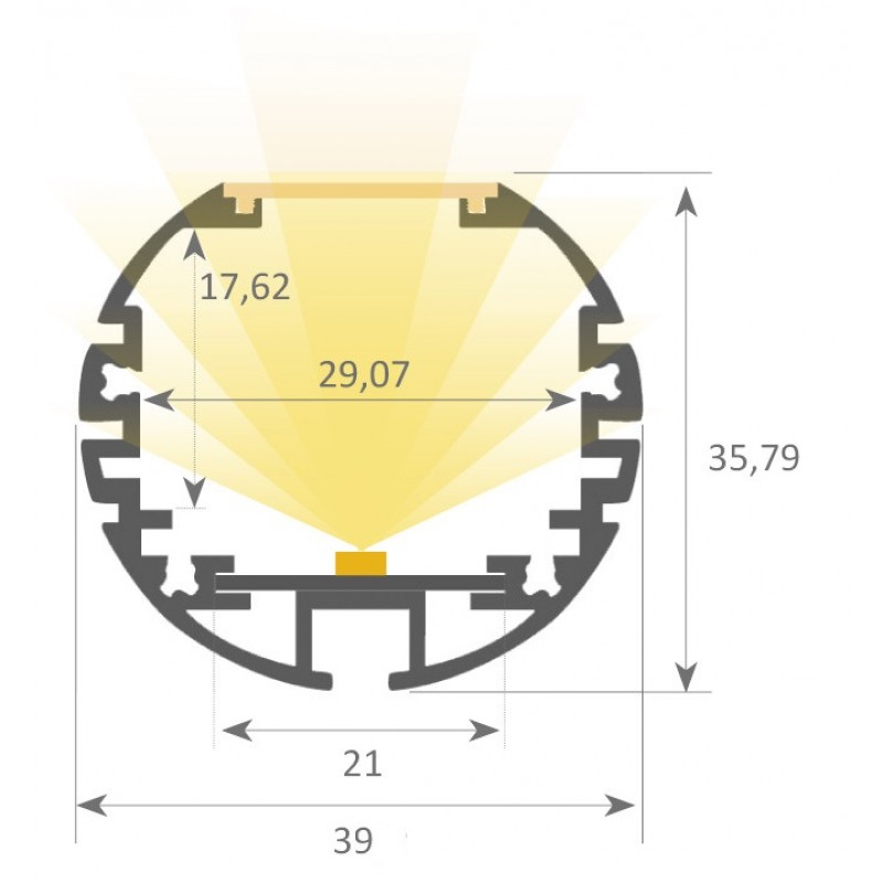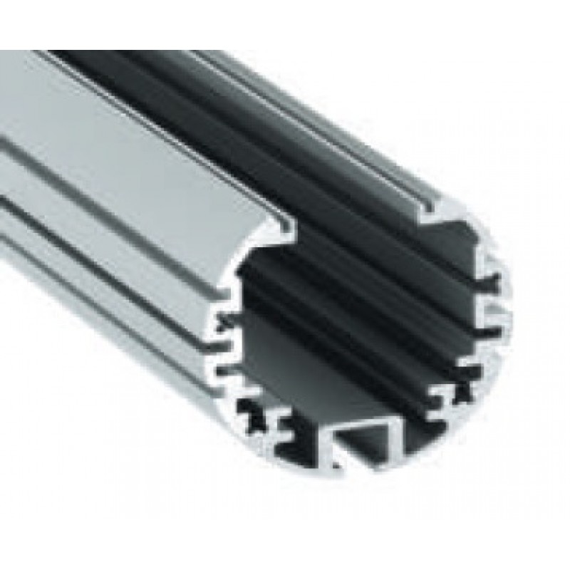 Perfil Redondo de aluminio anodizado de alta calidad, de 39mm. PR3939A. Barra de 2 metros. Se puede escoger el tipo de difusor entre opal, glaseado, transparente ó negro. Para instalar tira de LED.