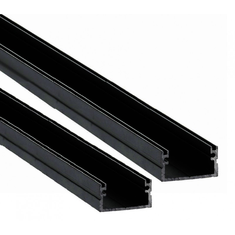 Perfil Superficie de aluminio anodizado Negro de alta calidad, de 20x11mm. PS2011AN6M., 6mts (2 tramos de 3 Metros). Se puede escoger el tipo de difusor entre opal, glaseado, transparente ó Negro. Para instalar tira de LED.