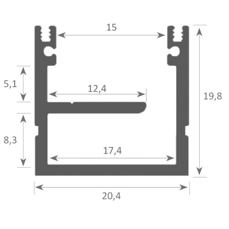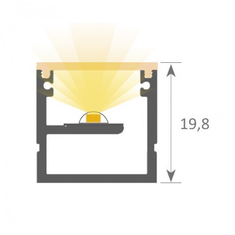 Perfil superficie aluminio anodizado 20,4x19,8mm para tiras LED PS2020A. Barra de 2 metros. Se puede escoger el tipo de difusor entre opal, glaseado, transparente ó Negro. Para instalar tira de LED.