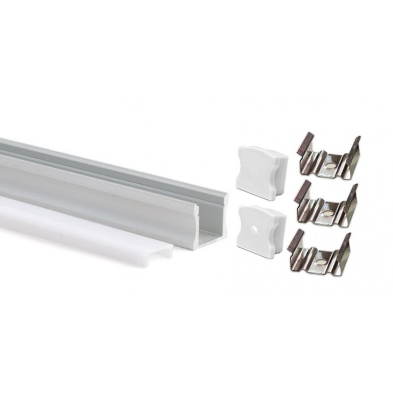 El precio incluye: Tira perfil, 1 tapas finales, 1 tapa final con salida cable, 3 grapas fijación y difusor.