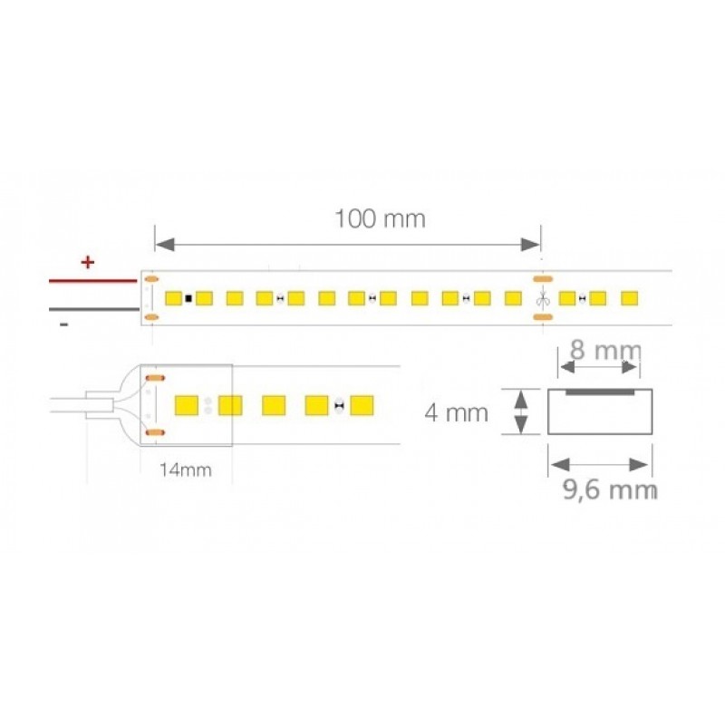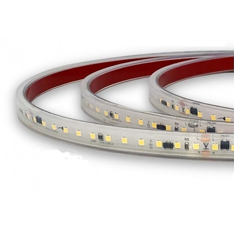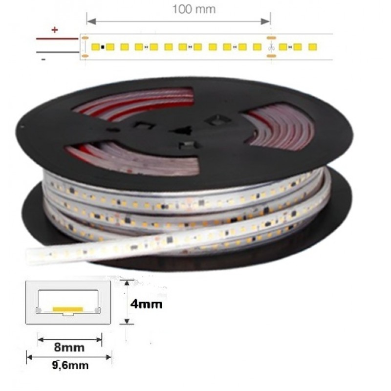 Tira LED 230V monocolor 14W/mt 120L/mt. SMD 2835 IP67 9,6x4mm corte cada 100mm, bobina de 50mts. TLD283514B50 Tira LED monocolor que cuenta con protección IP67 y utiliza LEDs SMD2835 con 14W de consumo por metro. Este tipo de tira LED flexible de alta tensión se conecta directamente a la red eléctrica de 230V AC. Del mismo modo, para completar el montaje y la protección IP67, se deben incluir accesorios necesarios. A la hora de utilizar esta tira de LED, hay que tener en cuenta su intensidad lumínica, por lo que tendremos que poner un objeto cercano en el que proyecte la luz. Si su fin es como señalización, (delimitar pasillo, resaltar zonas de paso,…) no es necesario buscar un objeto donde proyectar la luz.Ideal para iluminación de fachada, techos, residencias, teatros, zonas exteriores, vitrinas, luz comercial, escaparates. También son utilizadas para balizamiento de escaleras y pasillos.