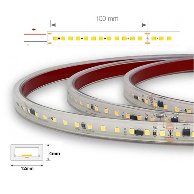 Tira LED 230V monocolor 17W/mt 120L/mt. SMD 2835 IP67 12x4mm corte cada 100mm, Venta por metros TLD283517M Tira LED monocolor que cuenta con protección IP66 y utiliza LEDs SMD2835 con 17W de consumo por metro. Este tipo de tira LED flexible de alta tensión se conecta directamente a la red eléctrica de 230V AC. Del mismo modo, para completar el montaje y la protección IP67, se deben incluir accesorios necesarios. A la hora de utilizar esta tira de LED, hay que tener en cuenta su intensidad lumínica, por lo que tendremos que poner un objeto cercano en el que proyecte la luz. Si su fin es como señalización, (delimitar pasillo, resaltar zonas de paso,…) no es necesario buscar un objeto donde proyectar la luz. Ideal para iluminación de fachada, techos, residencias, teatros, zonas exteriores, vitrinas, luz comercial, escaparates. También son utilizadas para balizamiento de escaleras y pasillos.