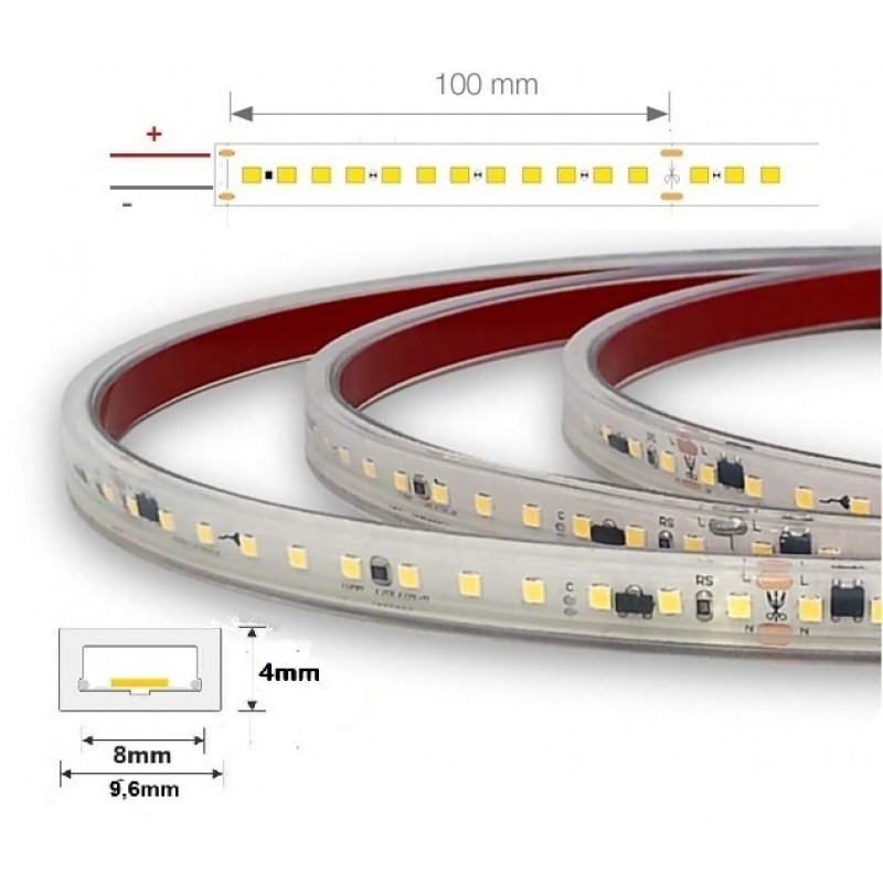 TTira LED 230V monocolor 5W/mt 120L/mt. SMD 2835 IP65 9,6x4mm corte cada 100mm, Venta por metros. TLD28355M Tira LED monocolor que cuenta con protección IP65 y utiliza LEDs SMD2835 con 5W de consumo por metro. Este tipo de tira LED flexible de alta tensión se conecta directamente a la red eléctrica de 230V AC. Del mismo modo, para completar el montaje y la protección IP67, se deben incluir accesorios necesarios. A la hora de utilizar esta tira de LED, hay que tener en cuenta su intensidad lumínica, por lo que tendremos que poner un objeto cercano en el que proyecte la luz. Si su fin es como señalización, (delimitar pasillo, resaltar zonas de paso…) no es necesario buscar un objeto donde proyectar la luz. Ideal para iluminación de fachada, techos, residencias, teatros, zonas exteriores, vitrinas, luz comercial, escaparates. También son utilizadas para balizamiento de escaleras y pasillos.
