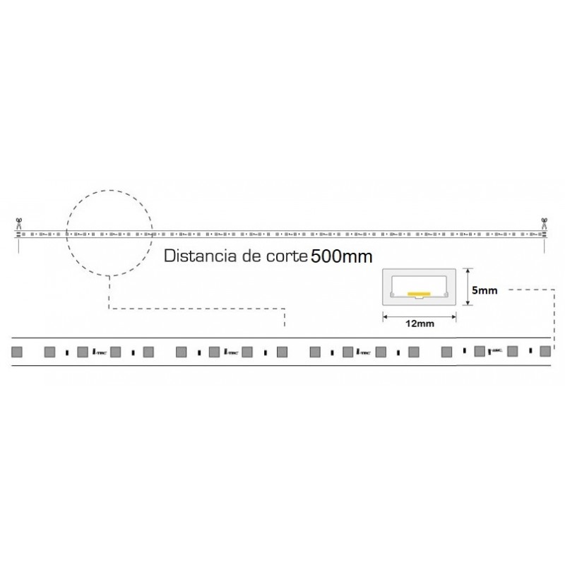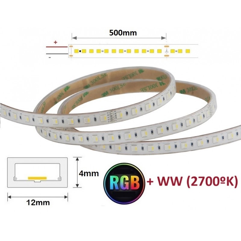 Tira LED 230V RGB+2700K 11W/mt 72L/mt. SMD 5050 IP67 12x4mm corte cada 500mm, Venta por metros TLD505011RGBWM. Tira LED RGB que cuenta con protección IP67 y utiliza LEDs SMD5050 con 11W de consumo por metro. Este tipo de tira LED flexible de alta tensión se conecta directamente a la red eléctrica de 230V AC. Del mismo modo, para completar el montaje y la protección IP67, se deben incluir accesorios necesarios. A la hora de utilizar esta tira de LED, hay que tener en cuenta su intensidad lumínica, por lo que tendremos que poner un objeto cercano en el que proyecte la luz. Si su fin es como señalización, (delimitar pasillo, resaltar zonas de paso,…) no es necesario buscar un objeto donde proyectar la luz. Ideal para iluminación de fachada, techos, residencias, teatros, zonas exteriores, vitrinas, luz comercial, escaparates. También son utilizadas para balizamiento de escaleras y pasillos.